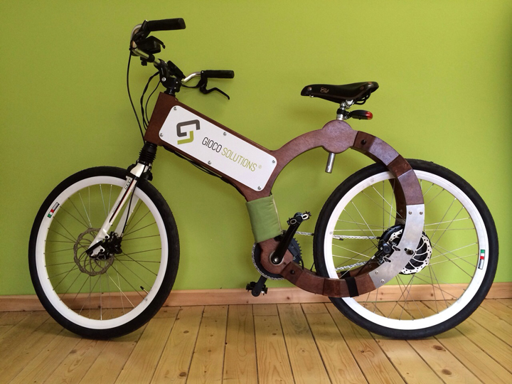 Gioco Solutions, une firme italienne basé à Turin, Monza et Avigliana, spécialisée dans les panneaux solaires flexibles, batteries et régulateurs de tension, pour des applications fixes (maisons, stations arctiques) ou nomades (voiliers, mobilhomes), s’est lancée dans le projet d’un e-bike avec cadre en bois. Pourtant ce dernier ne fera pas appel aux panneaux solaires pour charger ses batteries. Ces dernières sont des LiFePo4 (lithium, fer, phosphate) de 36 volts et 15Ah, qui alimentent un moteur arrière d’origine non précisée, tout comme son capteur. Il s’agit d’un modèle limité à 25 km/h, pesant 22 kg et pouvant espérer une autonomie de 120 km. Ses roues de 26 » supportent un cadre fait de bois contreplaqué résistant à l’ai marin. Il freine sur disque à commande hydraulique, possède une suspension dans la colonne de direction, une selle cuir Brooks, une potence ajustable, un cintre de ville cintré vers l’arrière et possède vraisemblablement des dérailleurs. Son prix n’est pas encore annonc et sa date de commercialisation est prévue pour avril 2015.